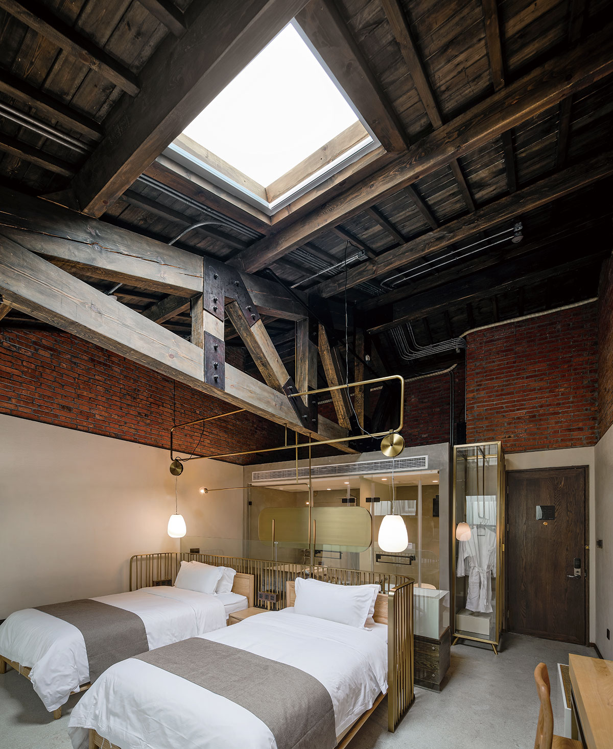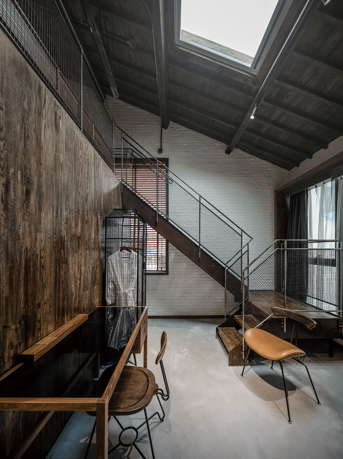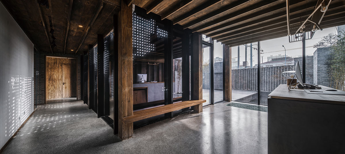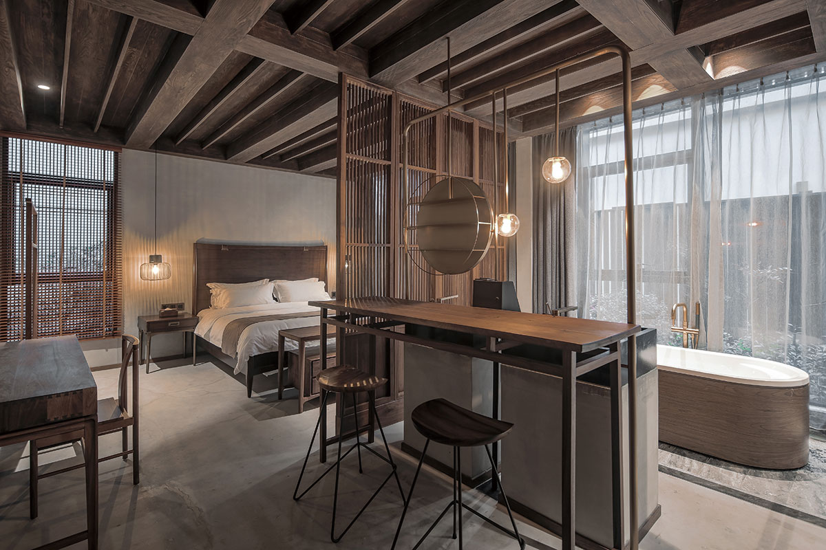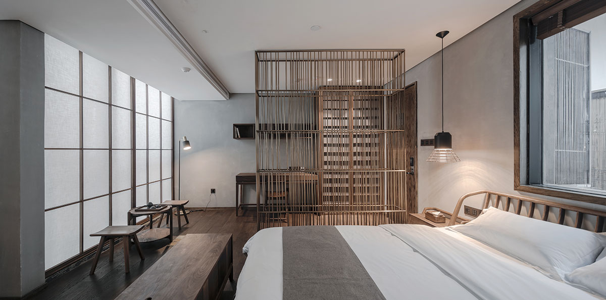 渝舍印象由兩棟樓組成,設(shè)計過程從整合的角度梳理了文化、自然、建筑之間的關(guān)系。以入口處以折疊巡回的青磚引入,為空間的公共與私密提供了過渡。參考北方的四合院和上海小院的特點,設(shè)計師大刀闊斧,在寸土寸金的上海市中心辟出一處院落,解決了建筑間的孤立狀態(tài),使客房、前廳大堂和咖啡廳視覺上遙相呼應(yīng),院落的引入集中體現(xiàn)了傳統(tǒng)建筑的造園思想。大片窗戶和鋼板組成干干凈凈的冷色基調(diào),與透出的暖黃光形成對比,正如渝舍印象的經(jīng)營模式:用酒店式的管理方法,民宿的人文情懷去經(jīng)營。這里有書籍、音樂、咖啡和茶,懶懶地坐在舒服的沙發(fā)上,發(fā)呆、看書、聊天,坐上一下午。
